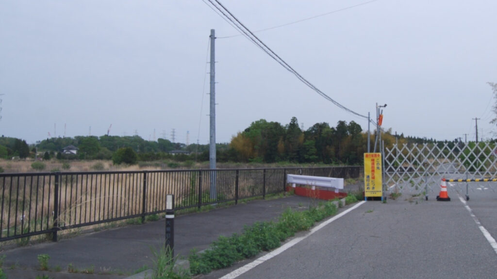 この先は立ち入り禁止区域。左奥が福島第一原発